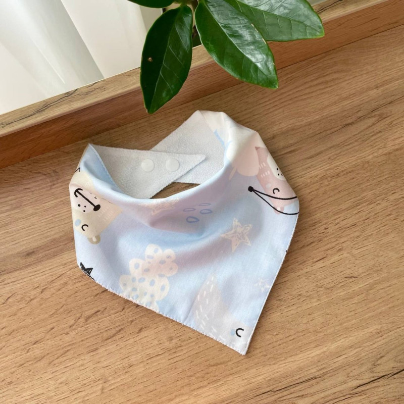 Слинявчик-куточок на кнопці являє собою трикутник розміром 46х23х23, двошаровий склад, 100% бавовна. Одна сторона виконана з попліну, а інша з м'якої махри. Між ними знаходиться спеціальний мембранний шар, який повністю водонепроникний.