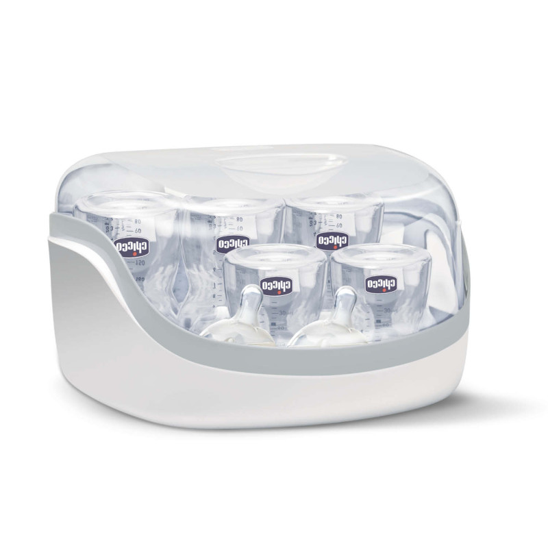 Стерилизатор Chicco швидко та результативно дезінфікує дитячі предмети (пляшки, соски, пустушки та ін.) у мікрохвильовій печі шляхом природної стерилізації парою. Вміст залишається стерильним під закритою кришкою – 24 години. Вмісткий Стерилізатор вміщує до 5 пляшок Chicco або інших невеликих предметів. Захист на 24 години Закритий стерилізатор гарантує стерильність пляшечок протягом доби. Практичний та компактний Підходить для більшості мікрохвильових печей потужністю від 600 до 1200 Вт. Швидка стерилізація парою – 3 хвилини (при потужності 1200 Вт). Укомплектований гігієнічними щипцями для зручного захоплення чистих пляшечок та аксесуарів. Знищує до 99,9% бактерій та вірусів Стерилізатор знищує до 99,9% шкідливих бактерій та мікробів без застосування хімічних засобів. Зверніть увагу: на стерилізатор Chicco для мікрохвильової печі діє гарантія терміном на 6 місяців. З детальними умовами можна ознайомитися в розділі Гарантія та сервіс.