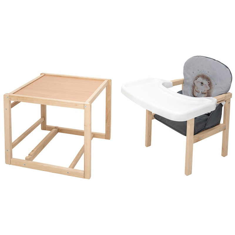 Згодом стілець перетворюється на зручне місце для ігор та творчості, просто знявши стільницю. Чохол сидіння виготовлений з легко митого матеріалу, забезпечуючи простоту догляду за виробом.