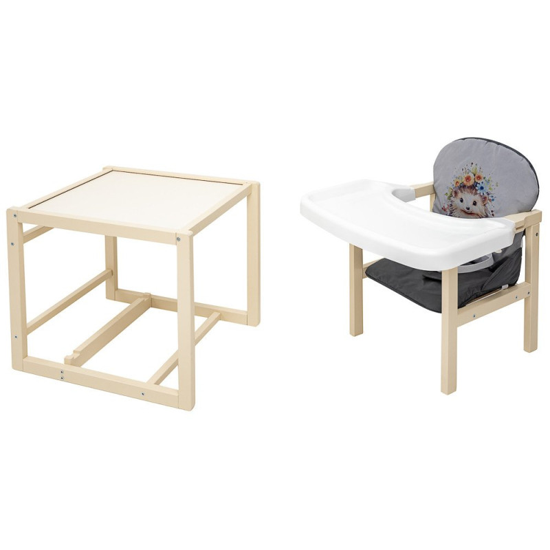 Згодом стілець перетворюється на зручне місце для ігор та творчості, просто знявши стільницю. Чохол сидіння виготовлений з легко митого матеріалу, забезпечуючи простоту догляду за виробом.