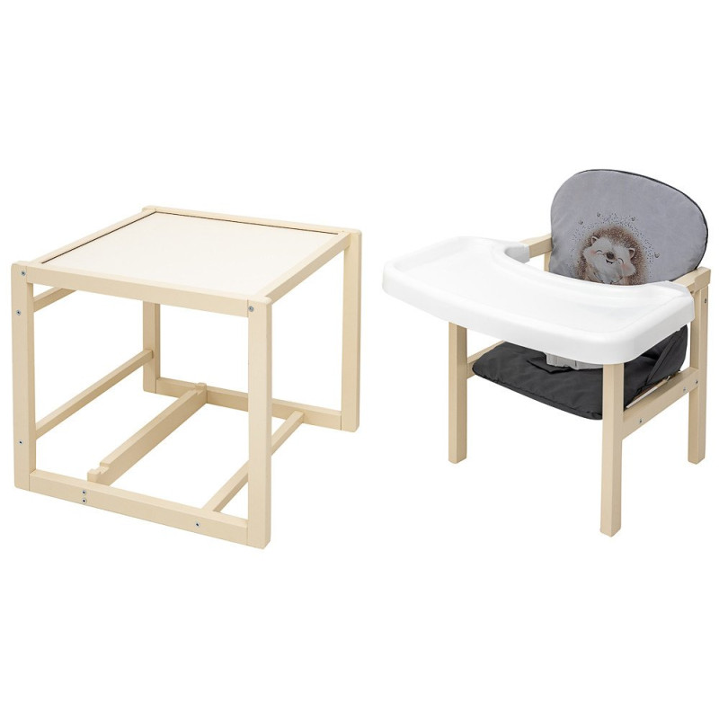 Згодом стілець перетворюється на зручне місце для ігор та творчості, просто знявши стільницю. Чохол сидіння виготовлений з легко митого матеріалу, забезпечуючи простоту догляду за виробом.