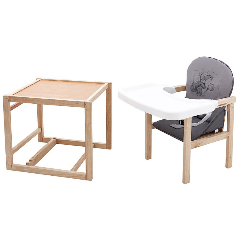 Пізніше модель трансформується у стільчик-парту для ігор та творчості. Для цього потрібно лише зняти стільницю. Чохол сидіння виконаний з матеріалу, що миється.