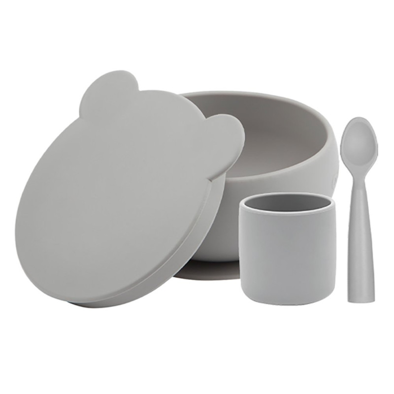 Купити або замовити онлайн Набір зручна форма для спільного відпочинку та годування силіконовий (миска з кришкою, чашка, ложка) MinikOiOi BLW Set I - Powder Grey Ви можете в магазині KIDZER.
