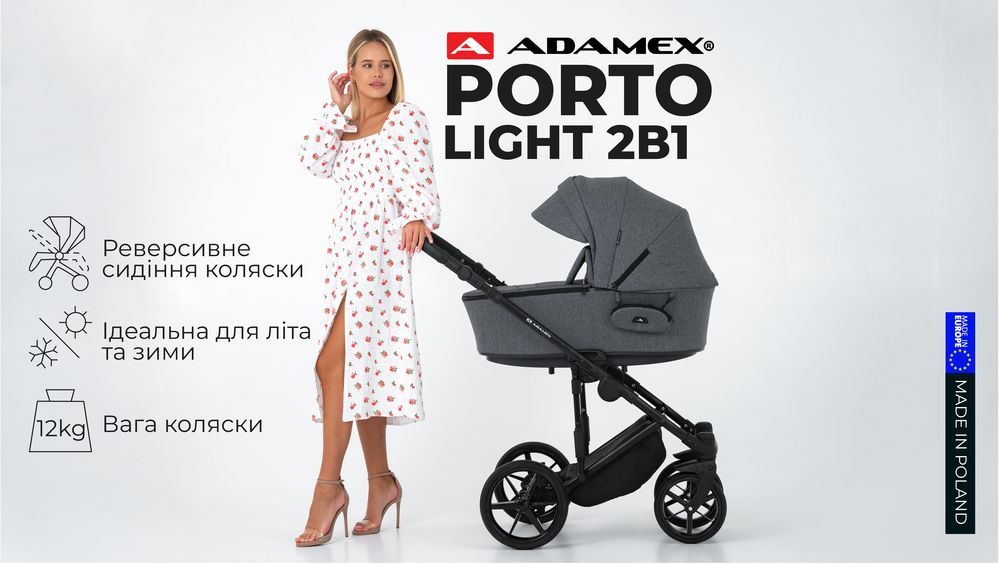 Коляска Adamex Porto Light - має модульний набір 2 в 1 на алюмінієвому шасі лаконічної форми, включає в себе люльку для найменших і прогулянковий блок. Легкість, зручність і безпека - ці три якості завжди поєднуються один з одним у візках Adamex, модель Porto Light розрахована на тривале використання з народження до 36 місяців.