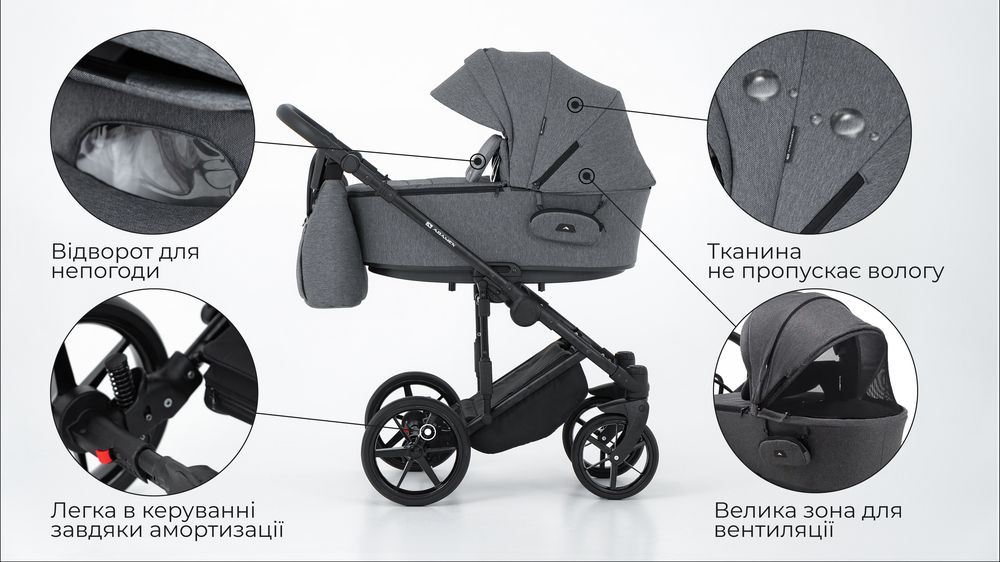 Реверсивне сидіння коляски за пару рухів встановлюється по ходу або проти ходу руху. Спинка опускається в горизонтальне положення за допомогою важеля, утворюючи разом з регульованою підніжкою зручне спальне місце. Виробник передбачив великий щільний капюшон, який відкривається до самого бампера. Накидка на ніжки разом з капюшоном відмінно захистять дитину від поганої погоди. Для теплих деньків у капюшоні є велика вентиляційна секція і додатковий козирок.