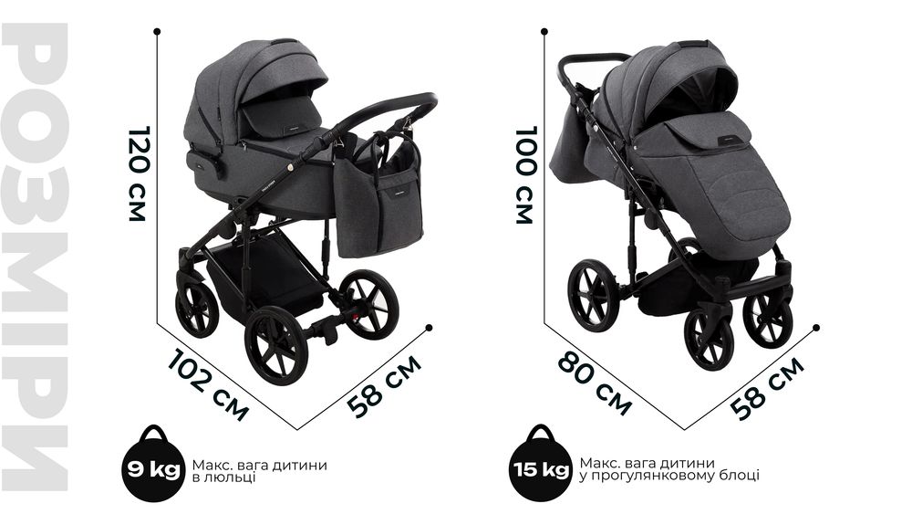 В розкладеному вигляді з прогулянковим блоком (ДхШхВ): 120х57х102 см.