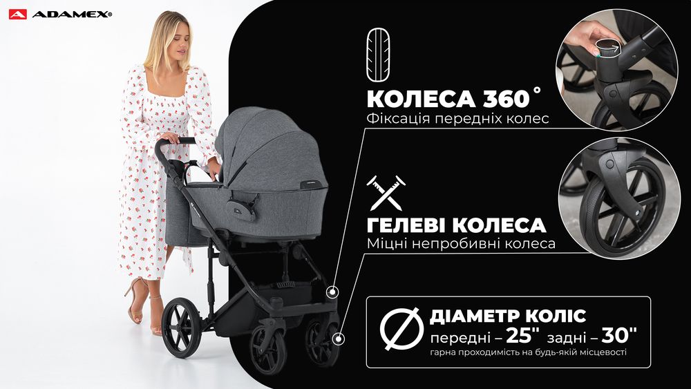 Коляска підлаштується під будь-який зріст. Ручку можна регулювати по висоті, натиснувши на дві кнопки з боків. Коляскою легко керувати по будь-якій місцевості, завдяки пружинній амортизації і міцним непробивним колесам. Передні полегшують маневрування коляскою, тому що крутяться навколо своєї осі на 360 градусів. Для подолання, наприклад, засніжених ділянок дороги заблокуйте колеса в прямому положенні.