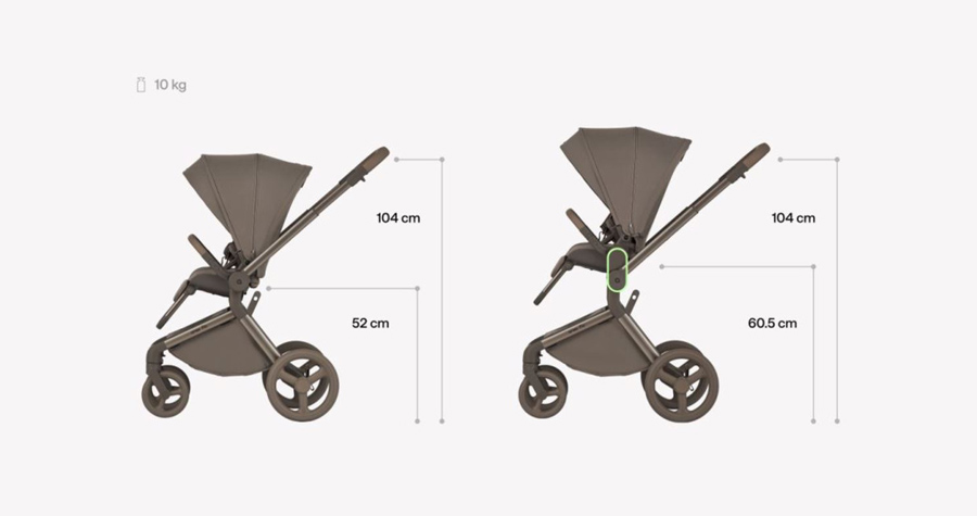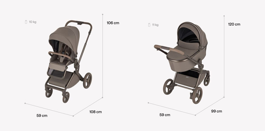 - Breathing system. У колясці представлена вдосконалена система вентиляції, яка забезпечує потік повітря у всіх необхідних місцях — від капюшона та передньої частини люльки до підніжки і капюшона прогулянкового блоку.