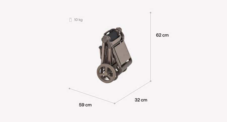- Space saver. Рама складається разом із сидінням в обидва напрямки. Складена коляска може стояти вертикально без опори, що дозволяє оптимально використовувати простір. Для зручного перенесення передбачена ручка.
