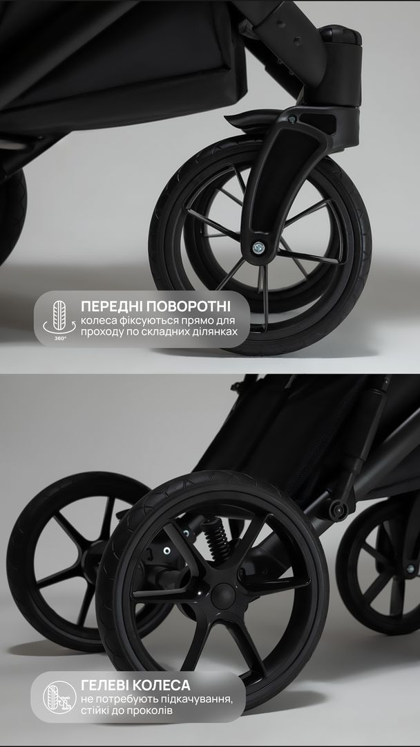 Сучасна алюмінієва рама з надійною системою підвіски, чотири міцні колеса, поворотні колеса з фіксацією, відмінно підлаштовуються під будь-яку місцевість та гарантують оптимальний комфорт.