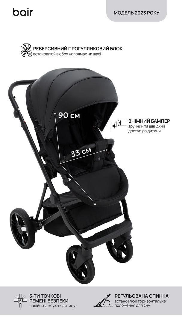 Прогулянковий блок коляски Bair Lion реверсивний, що дозволяє вибирати напрямок руху. Спинка регулюється в декількох положеннях, включаючи горизонтальне.