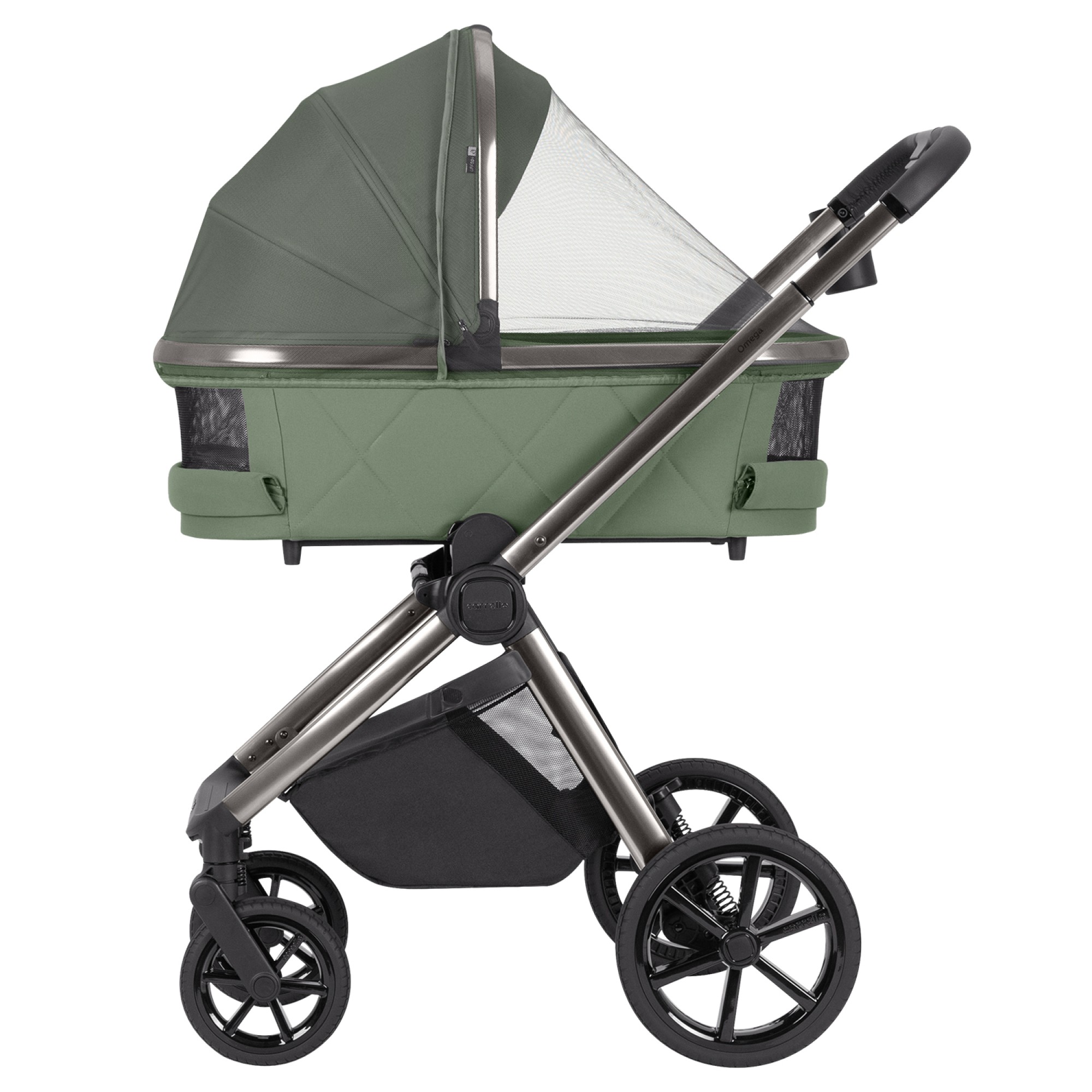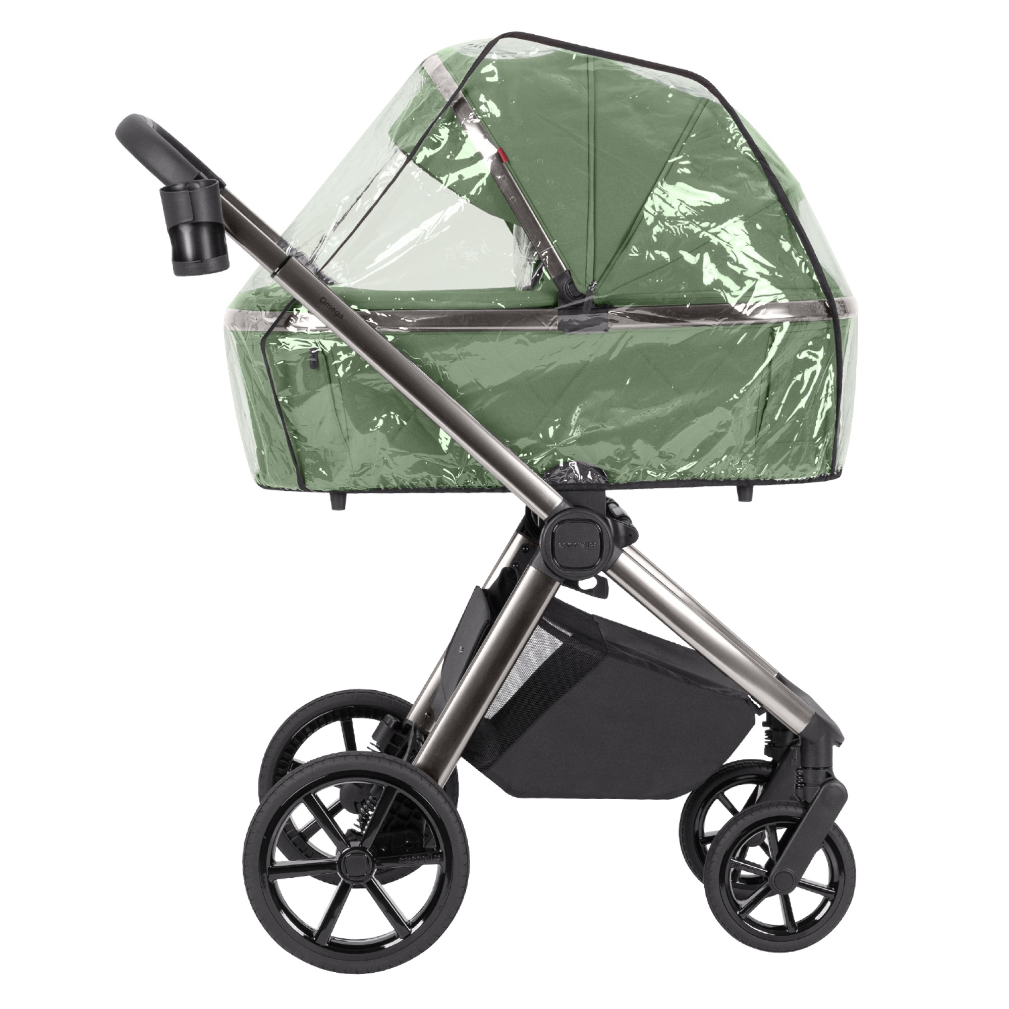 Люлька CARRELLO Omega розрахована для найменших до 6 місяців і ваги до 9 кг. Вона виготовлена з багатошарового текстилю, який захищає від вологи та ультрафіолету (spf 50). Капюшон оснащений знімним козирком, додатковою секцією для збільшення висоти та вентиляційним вікном під блискавкою. Люлька вентилюється через три сітчасті вікна, інтенсивність притоку повітря регулюється магнітними клапанами. У холодну погоду вентиляційні віконця можна повністю закрити для збереження тепла. У комплекті є москітна сітка та дощовик, які забезпечать захист у будь-яку погоду.