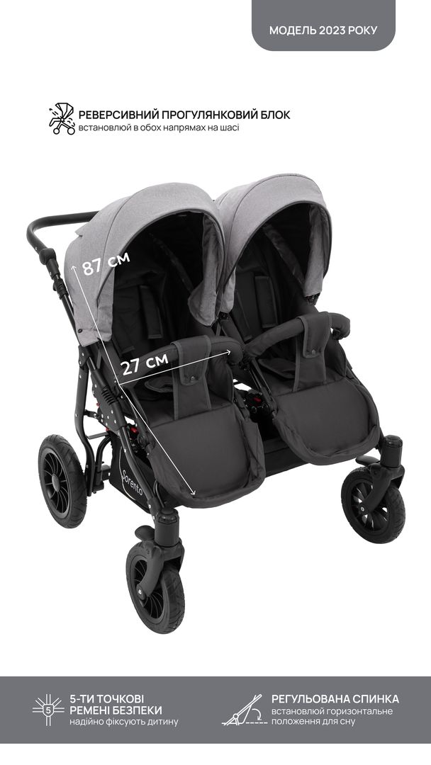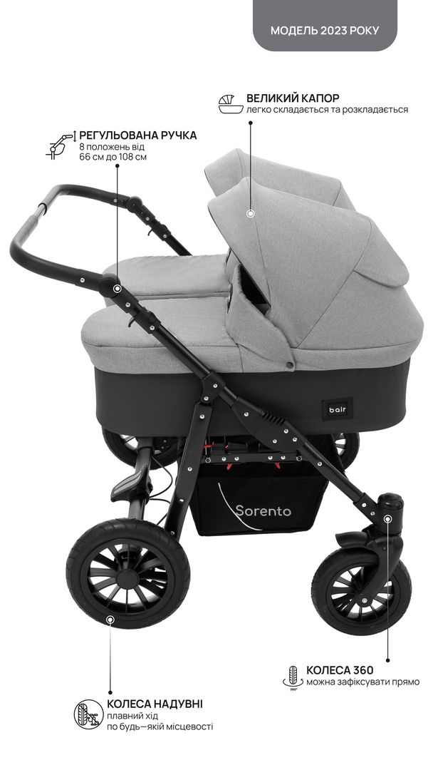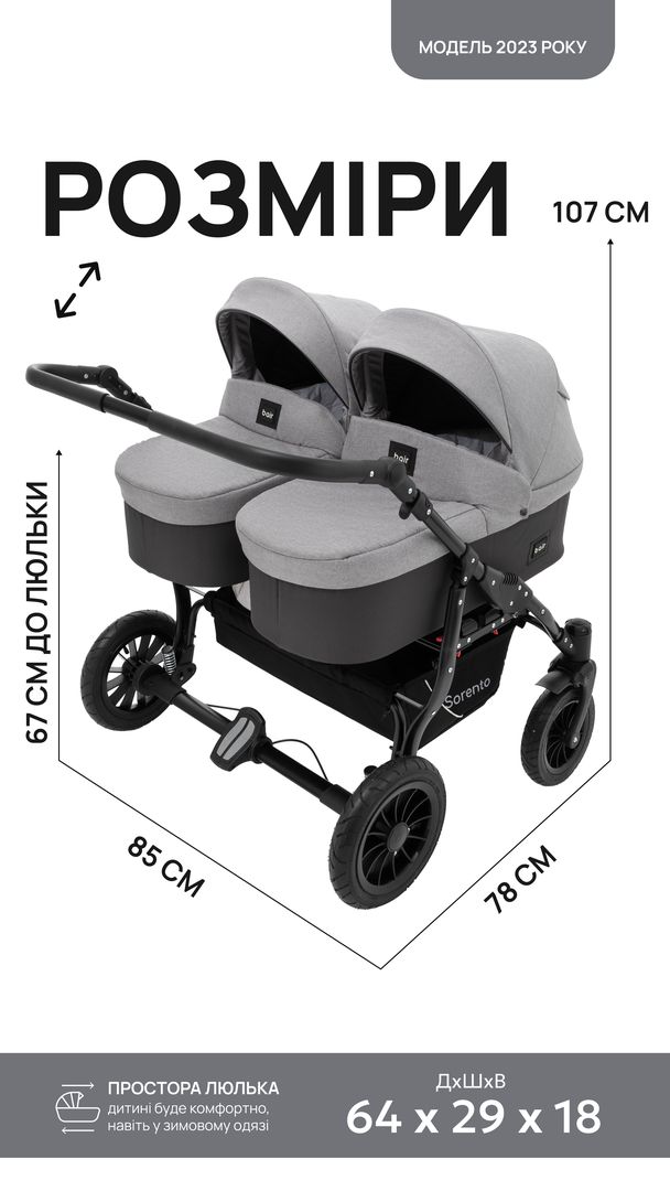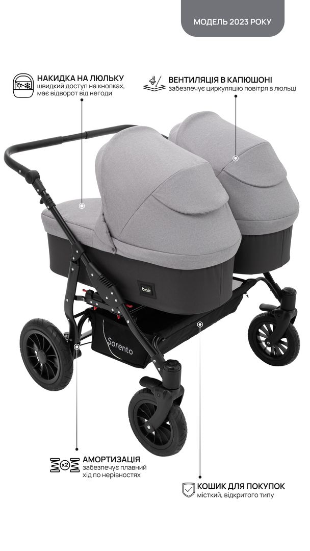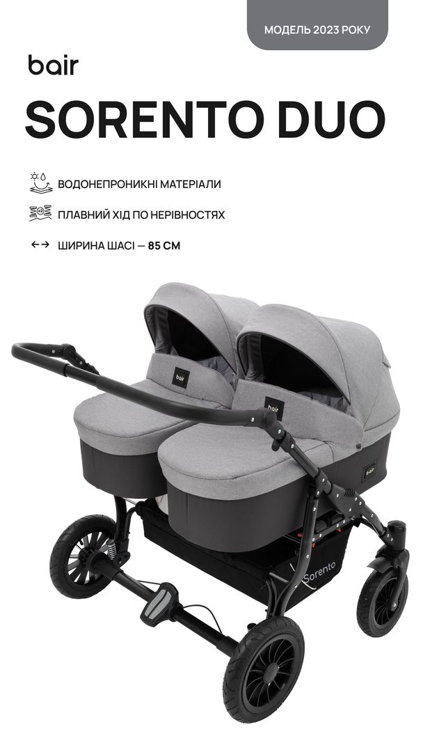 для щоденного використання візочок Bair Sorento DUO 2 в 1 для двійнят або двох діточок різного віку, підійде для найменших або дітей від півроку до трьох років. Обох малюків можна укладати в люльки або прогулянкові сидіння, а можна і комбінувати змінні блоки.