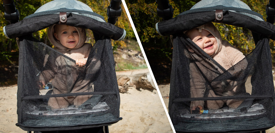 • Можливість подовження каптура підвищує комфорт малюка під час прогулянок, незалежно від погоди та пори року. Варіант, корисний у будь-який час року, захищає від опадів взимку та від сонця влітку.