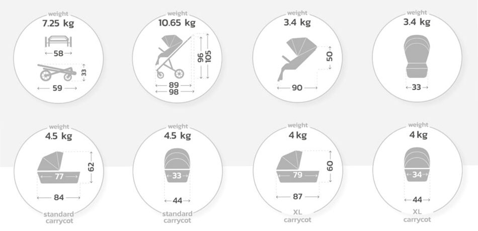 • Ви можете скласти коляску однією рукою з розташованим прогулянковим сидінням як лицем вперед, так і назад. Складається до 59 x 58 x 33 см.