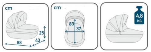 - Зовнішній розмір люльки: 88 х 43 см. Внутрішній розмір по верху люльки: 84 х 38 см. Глибина люльки: 25 см. Вага люльки: 4,8 кг.