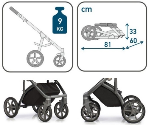 - Сталева рама коляски пофарбована порошковою фарбою в чорний, білий або сірий колір. Складається рама дуже компактно - 81 х 60 х 33 см, і має вагу 9 кг.