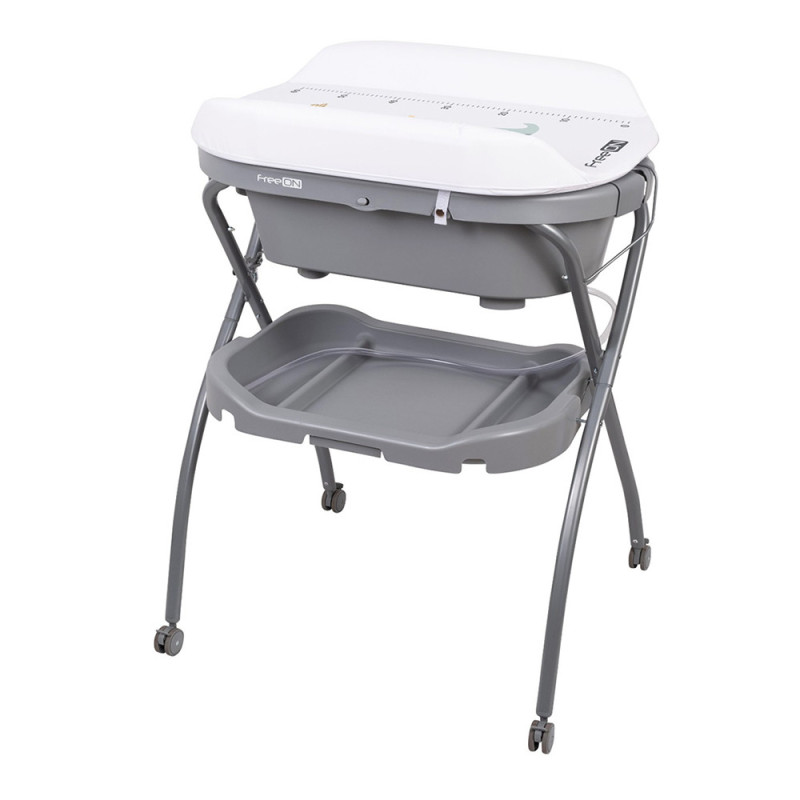 Дитяча ванночка зі сталевою стійкою, 4 колесами з гальлюдини, поличкою для зберігання та м'яким пеленальним матрасиком із ПВХ із принтом і шкалою для вимірювання зросту малюка.