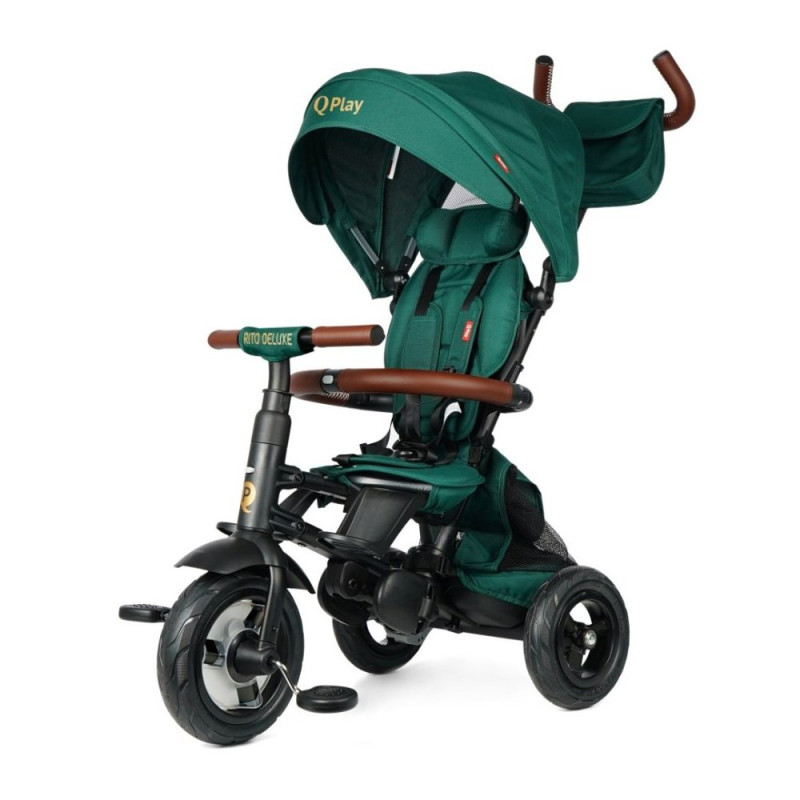 Qplay Rito Deluxe також оснащений сумкою на батьківській ручці, відсіком для дитячого приладдя знизу та опорною ніжкою, яка дозволяє залишити складений велосипед у вертикальному положенні. Велосипед забезпечує максимальну безпеку під час прогулянки завдяки захисному обмежувачу та п'ятиточковим ременям безпеки з м'якими накладками, які запобігають випаданню дитини. Цей велосипед належить до сімейства продуктів GROW UP і "зростає" разом з вашою дитиною, завдяки чому його можна перетворити на класичний триколісний велосипед.