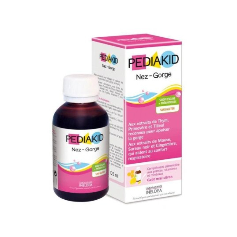 PEDIAKID NEZ-GORGE - натуральний питний засіб для дітей на основі нектару агави, пребіотиків та екстрактів листа чебрецю, листа першоцвіту, листа мальви лікарської, квітів чорної бузини, квітів липи, плодів ацероли, кореня імбиру; з прополісом, вітаміном С, цинком та міддю. Смак: медово – лимонний.